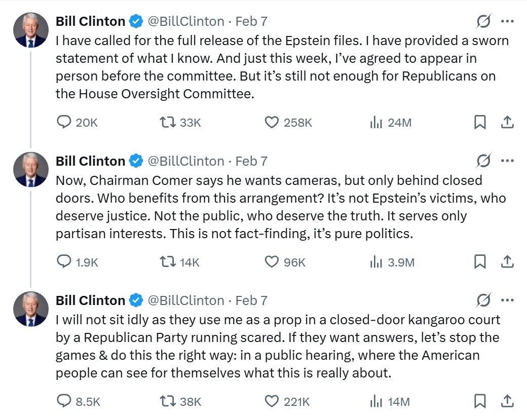 In a post on X, Bill Clinton said he would not participate in what he described as a “closed-door kangaroo court,” accusing Republicans of using the process for partisan purposes.