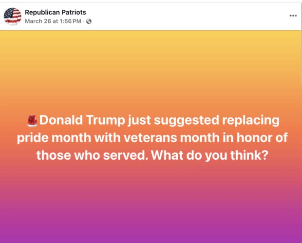 A viral Facebook post claims President Donald Trump suggested replacing LGBTQ+ Pride Month with Veterans Month. There is no evidence to support that claim.