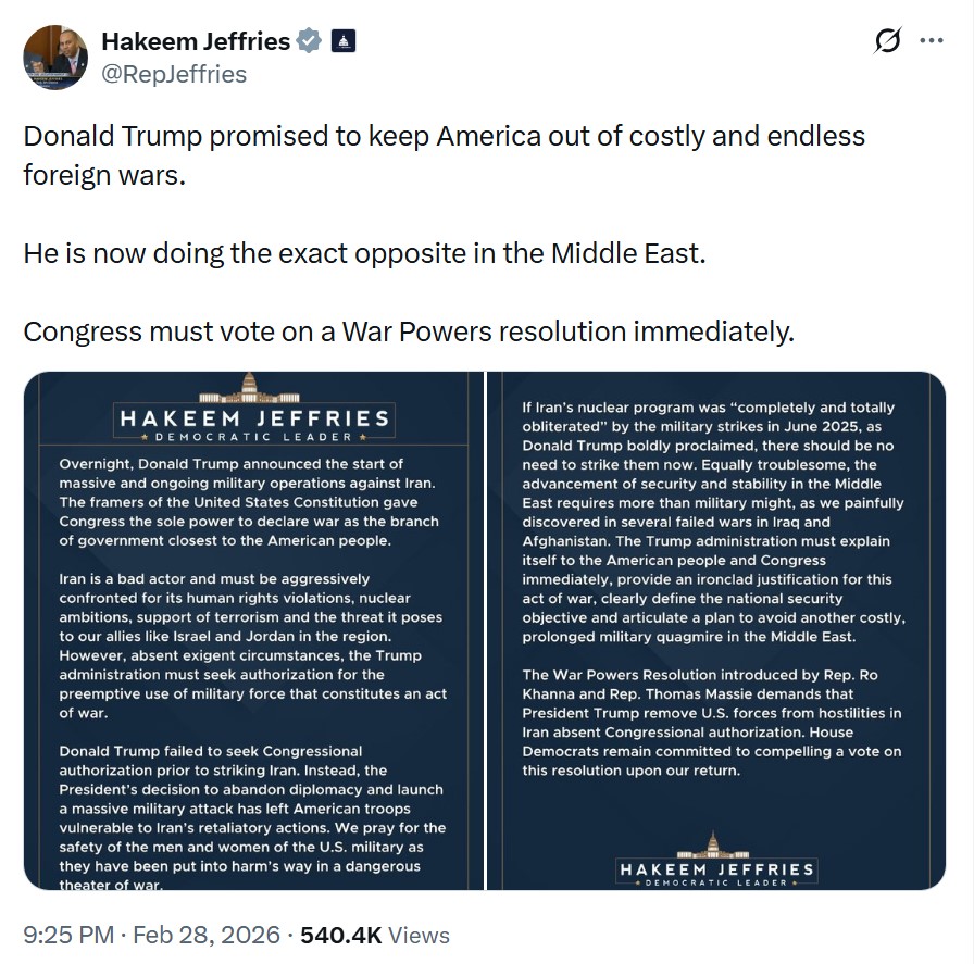 “Donald Trump pledged to keep the United States out of costly and endless wars,” Jeffries wrote. “Now he appears to be doing the opposite.”