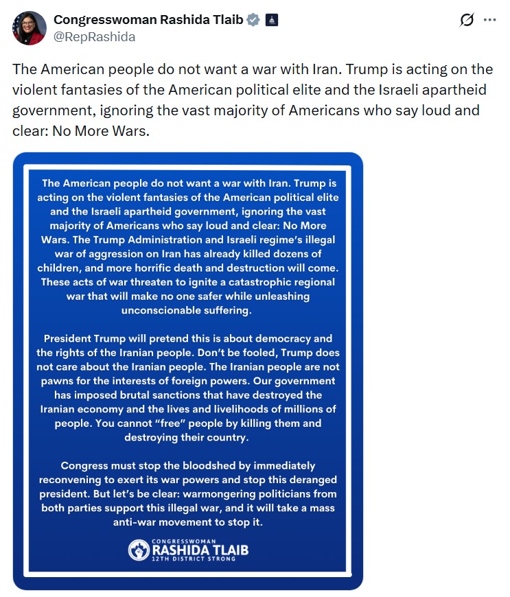 “Americans have made it clear that they do not want another war,” Tlaib wrote on social media. “This decision reflects the priorities of political elites rather than the will of the people.”