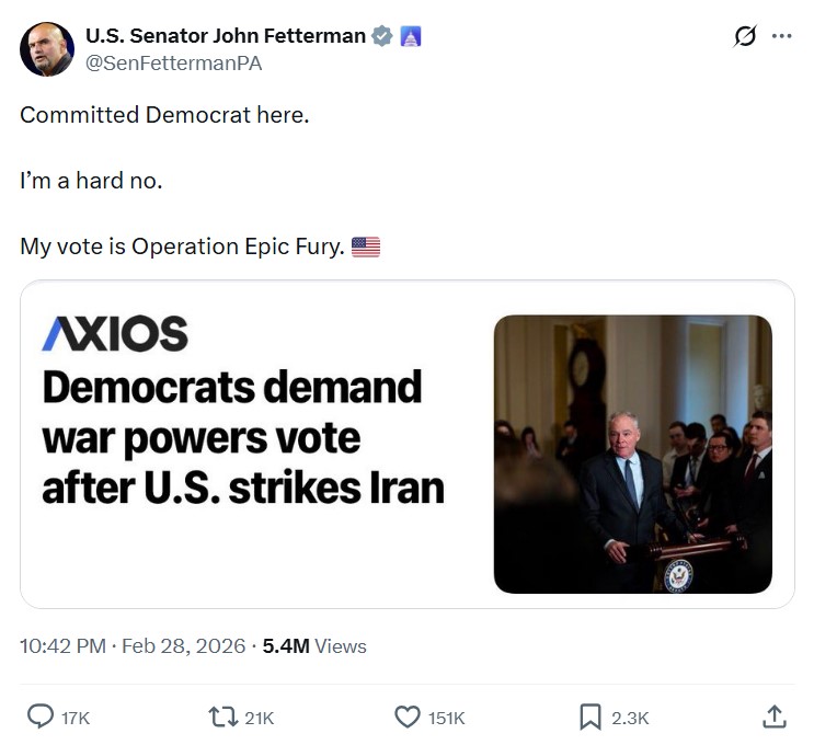 “My vote is Operation Epic Fury,” Fetterman wrote in a brief message on social media.