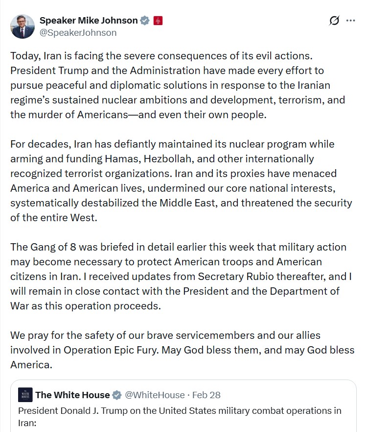 House Speaker Mike Johnson said the administration had previously pursued diplomatic solutions but that Iran continued expanding its nuclear capabilities and supporting militant groups across the region.