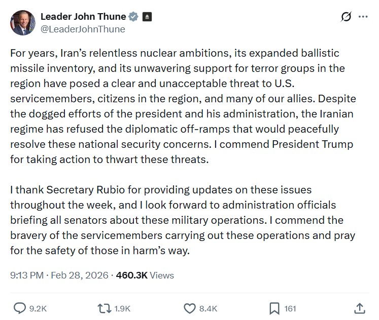 Senate Majority Leader John Thune also praised the operation, describing Iran as a persistent threat to U.S. forces and allies.