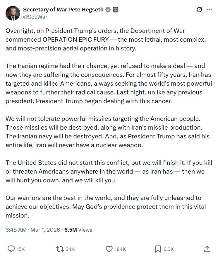 “For nearly fifty years the Iranian regime has threatened the United States and our allies,” Hegseth said. “Iran will never be allowed to obtain nuclear weapons.”