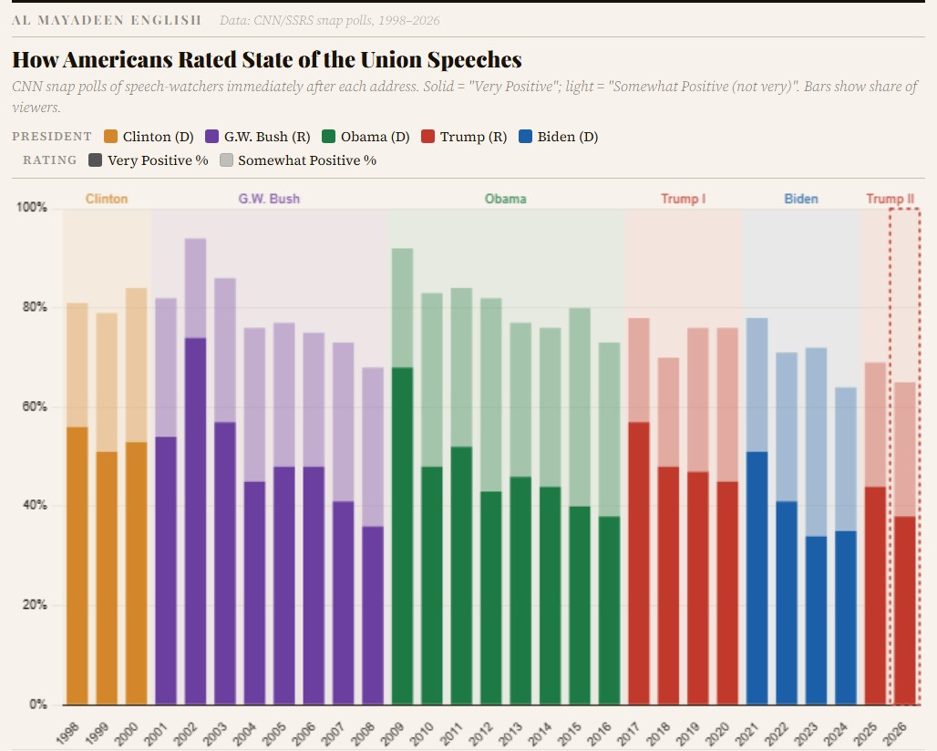 For comparison, historical highs remain far above this year’s rating. George W. Bush’s 2002 State of the Union, delivered months after the September 11 attacks, drew a 74% “very positive” response. Barack Obama’s 2009 debut reached 68%.