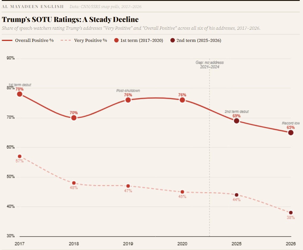 The 38% “very positive” rating marks a continuation of a gradual decline across Trump’s addresses. His 2025 joint address earned a 44% “very positive” response. In 2019, the figure stood at 47%. His 2017 debut speech reached 57%, the highest mark of his presidency.